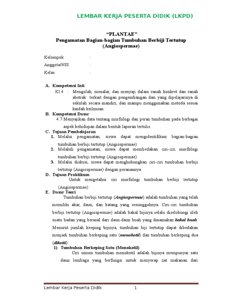 Lkpd Pengamatan Bagian Bagian Tumbuhan Berbiji Tertutup Angiospermae Pengamatan Bagian Bagian Tumbuhan Berbiji Tertutup Angiospermae