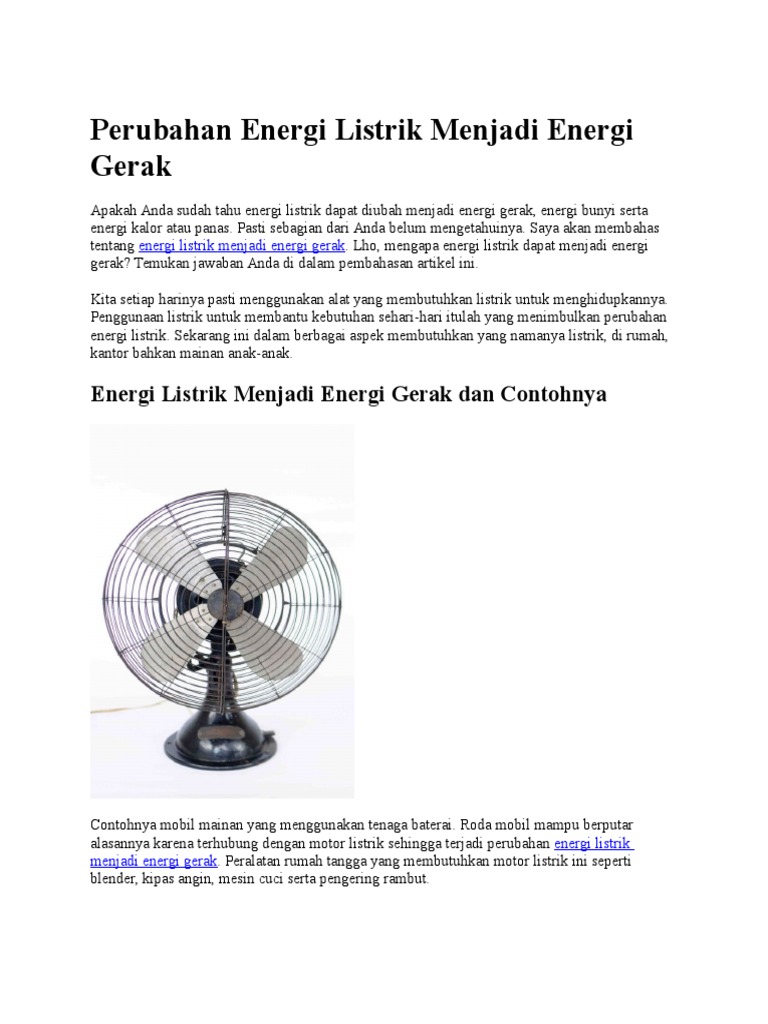 Adanya motor listrik membuat peralatan tersebut dapat menghasilkan energi gerak. Misalnya kipas angin listrik mengubah energi listrik menjadi energi gerak menghasilkan panas pada motornya. Kembali ke soal kita akan melihat bagaimana perubahan energi yang terjadi di setiap alat listrik berikut ini.