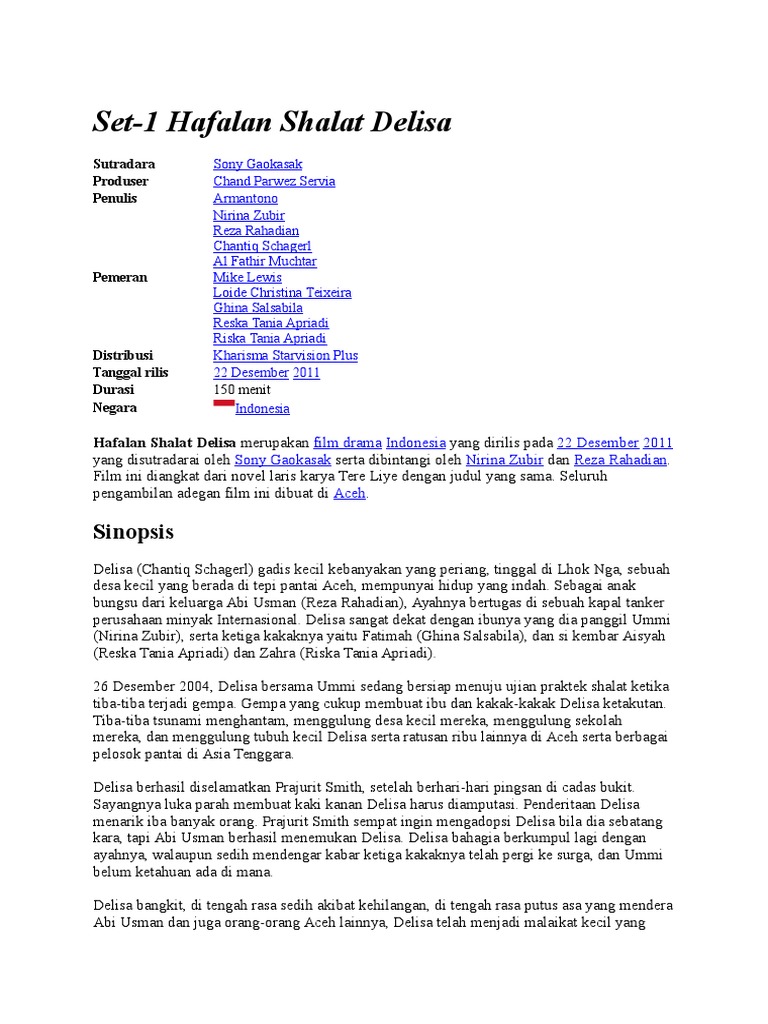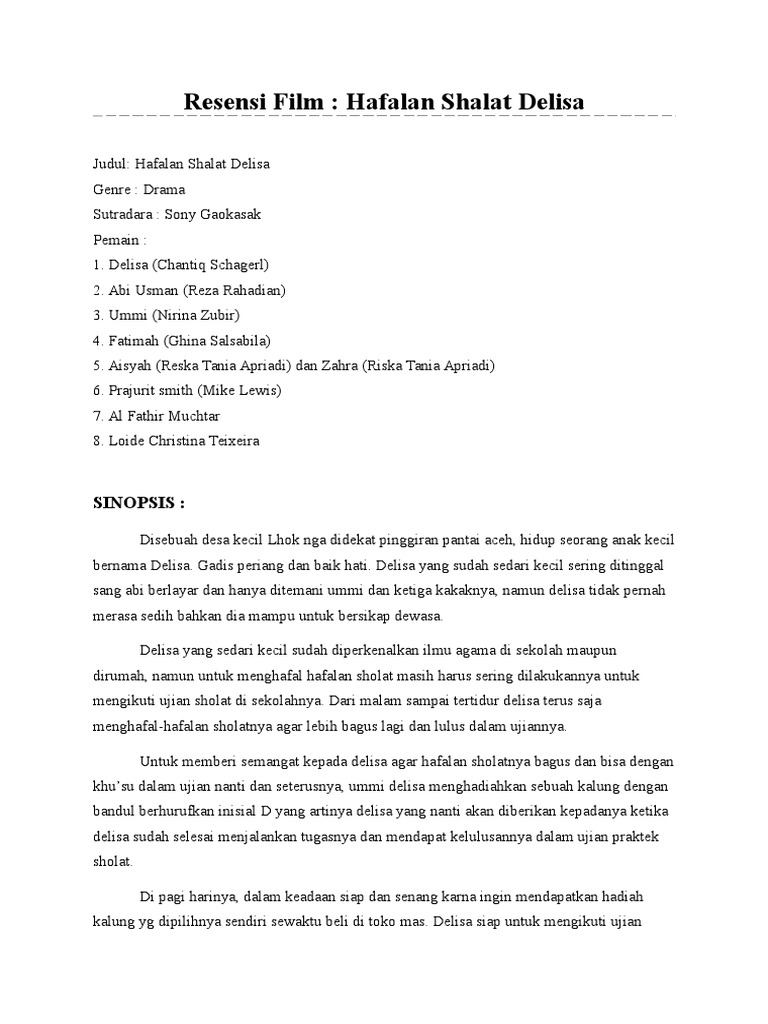 Hafalan Sholat Delisa Penulis. 3 Contoh Resensi Film Laskar Pelangi. Film ini mengisahkan mengenai sebuah desa bernama Lhok yang didekat pesisir pantai aceh hidup seorang anak kecil bernama Delisa dan dengan mempunyai kakak dan adik bernama Fatimah Aisyah Zahra.
